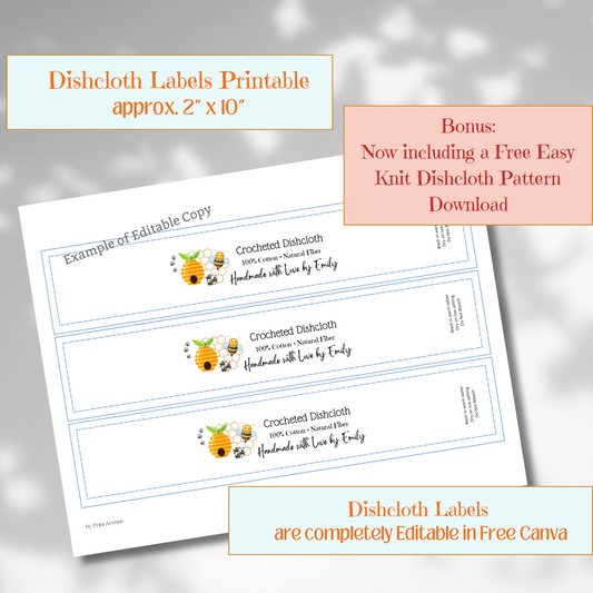 Dishcloth Wrap Labels, for Everyday • Posies, Honey Bees - DIY Knit Wash Cloths Tags -Edit in Free Canva •