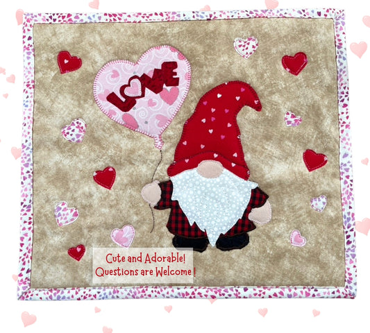 Valentine Love Gnome Mini Quilt 13"x18 - Mug Rug 10"x12", 2 Patterns - Complete Instructions