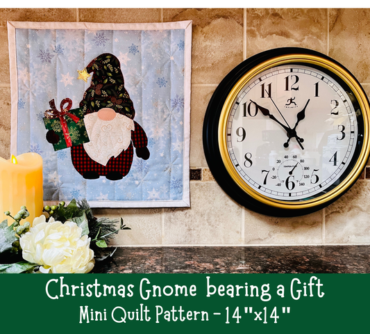 Christmas Gnome bearing a Gift Mini Quilt - Complete Instructions, and Illustrations are included.