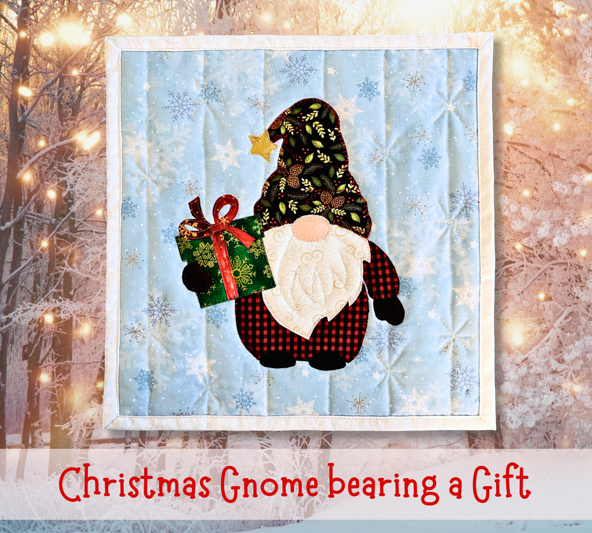 Christmas Gnome Bearing a Gift Mini Quilt—Complete Instructions and Illustrations are included. A guide for Fusible Applique is also included—plus a bonus!